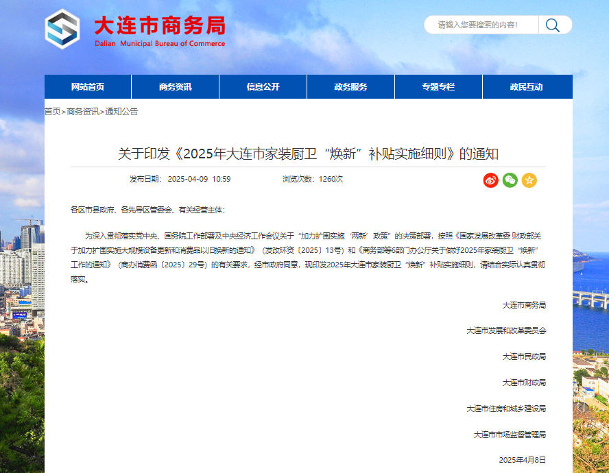 • 【国补政策】2025年大连市家装厨卫“焕新”补贴实施细则