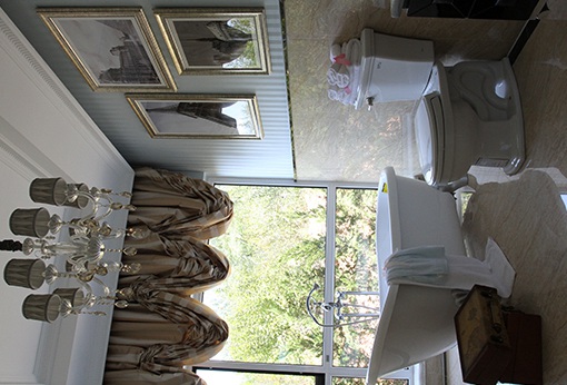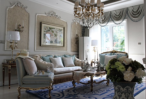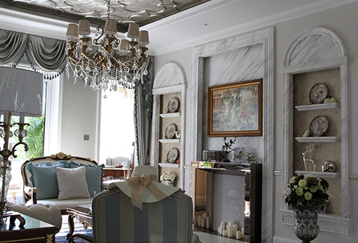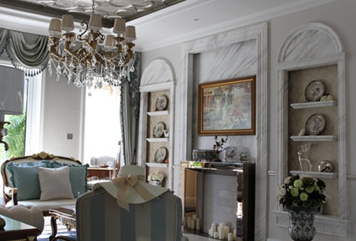 理石背景的电视背景墙,吊顶的LV图案雕花,奢华的水晶灯,点缀与空间的配饰,让空间变得高贵,大气。真正展现了法国风情的魅力。