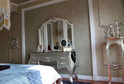 主卧,大气的银色床头,搭配上柔软的深蓝色床品,让忙碌了一天的人们,回家后能享受到更加舒适的休息环境。高贵的梳妆台,珍珠项链,银色镶钻的首饰盒,尽显法国贵妇的高贵气质。房间整体的银色雕花,充分展现了法式风格的特点。让高贵典雅的法国风情不在一般。