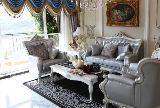 玄关过廊尽头的马赛克和面面相觑的天鹅,客厅的银色沙发,茶几上的蓝色妖姬,餐厅的烛台,昂贵的香槟,增加了空间的法式情调。
